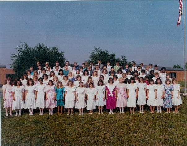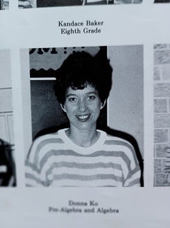 I can’t finish a post about eighth grade without saying something about Brandy Splawn. Brandy is in that picture up there of all of us, on the first row, fifth from the right, wearing a lightly-patterned dress (the pattern doesn’t show up in this shot so much, but does in the real picture) and a smile like she usually had. She was on her way to get a graduation dress for eighth grade graduation when she was tragically killed in a car accident in the spring of 1990. It didn’t happen long after that class picture was taken. Brandy was a vibrant, beautiful human being, and the world is worse without her.
