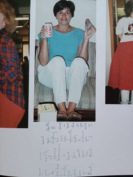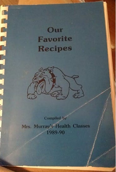 In eighth grade, it was a joy to have Mrs. Murray for Health and PE again. Therein ensued more wiffleball in the gym, basketball out on the blacktop (I sprained a finger catching a hard pass out there that year and had to wear a little aluminum and foam splint for a while), softball, volleyball, and other glorious activities that again got us away from the norm and our blood pumping. Also that year, Mrs. Murray’s classes put out a fundraising cookbook (a novel idea, that). I still have mine, though it’s a little dog-eared after the decades:
